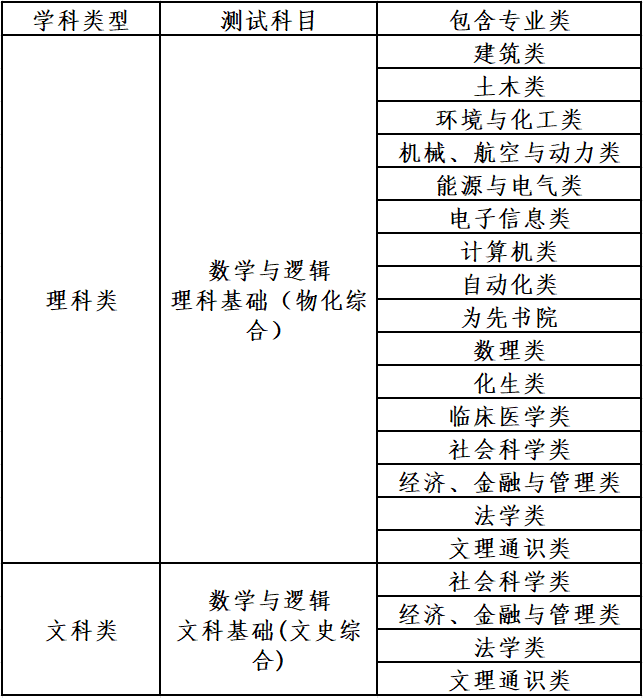2.初试:初评“通过”的学生需参加我校组织的初试。初试采用笔试形式,考试科目为:数学与逻辑、理科基础(物化综合)或文科基础(文史综合),学生依据填报的学科类型参加其中两个科目的考试。我校将根据学生初试成绩分省、分科类确定初试通过名单。初试结果将在报名系统内公布。