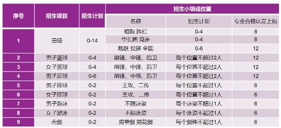 田径:各分项测试的第一名,根据其测试成绩,综合考虑本校的招生计划和不同分项的急需程度,经学校相关程序确定专业合格名单及认定排序。